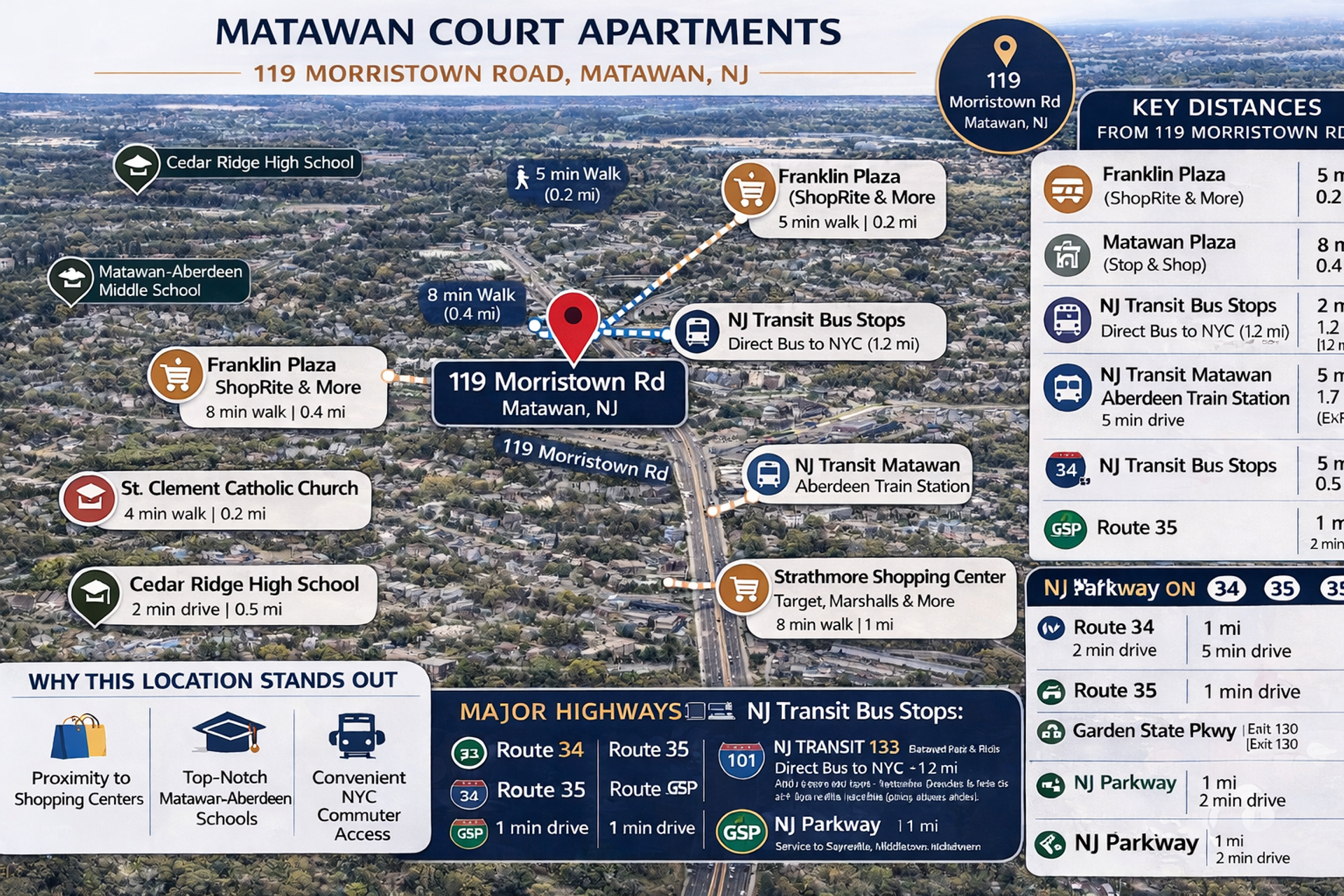 Welcome to Matawan Court Apartments, located in Matawan, NJ. Our apartments offer the convenience of having heat and hot water included in your rent, as well as a washer and dryer in each unit for added convenience. With off-street parking for one car, you'll never have to worry about finding a spot when you come home. Enjoy the ease of commuting with close proximity to the NJ Transit bus station to New York City and easy access to the NJ Parkway (I-95). Inside your apartment, you'll find spacious walk-in closets and granite countertops for a touch of luxury. Experience comfortable living at Matawan Court Apartments.